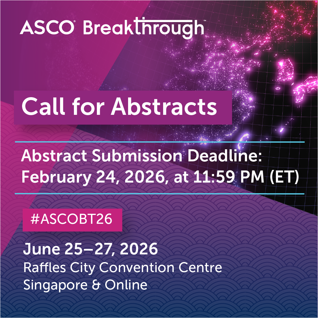 Bring your discoveries to the global dialogue shaping the future of cancer care. Submit your abstract to ASCO Breakthrough in Singapore by 11:59 pm ET on February 24 to present your work to an influential international audience. This is your opportunity to connect global science with regional expertise, accelerating breakthroughs across the Asia-Pacific and beyond. All accepted abstracts are published in a citable Journal of Clinical Oncology (JCO) supplement. With over 40 Abstract Awards available, now is the time to elevate your professional profile. Share your research and be heard on a premier stage. Learn more at breakthrough.asco.org.